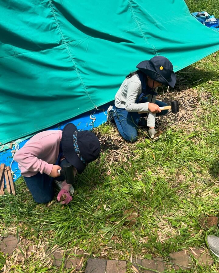 昨年までの年上スカウトの姿を見て憧れがあったようで「ペグやってみたかった!」「自分で作ったテントに入りたい!」と気合十分で参加していました☺️