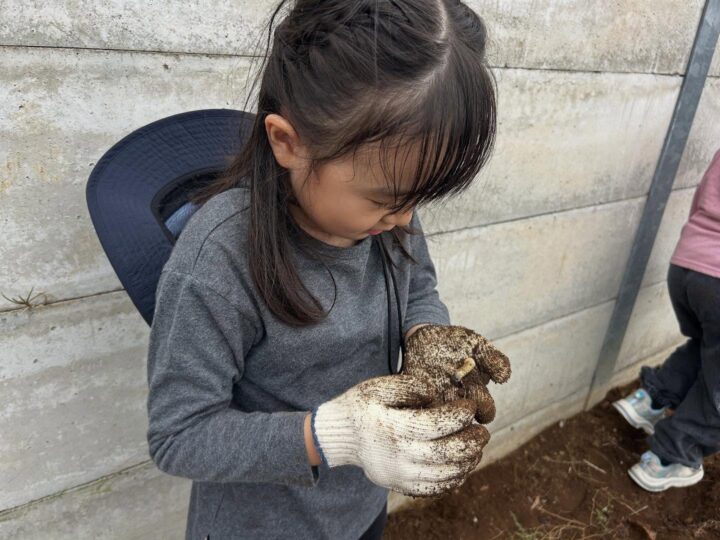土を掘っていると、幼虫やトカゲ・カタツムリなどたくさんの虫と出会うことができました。自然大好きな年少スカウトたちは「持って帰って飼いたいな〜」と観察したり、お家を作ってあげたりしていました☺️