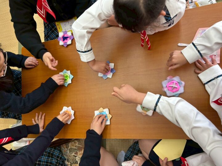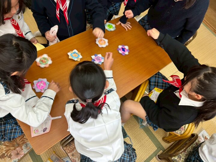 新年最初の集会は、正月にちなんで折り紙でコマと絵馬をつくりました!