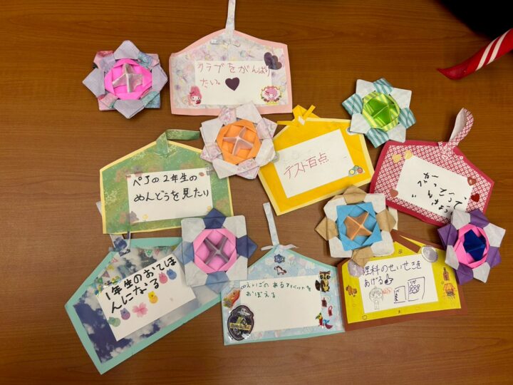 その後はオリジナル絵馬作り!画用紙と折り紙を選び、カットして中央のカードに今年の抱負を書きました。学年問わず『勉強』に関する抱負を書くスカウトが多く、リーダーたちが思わず感心するほどでした🧐